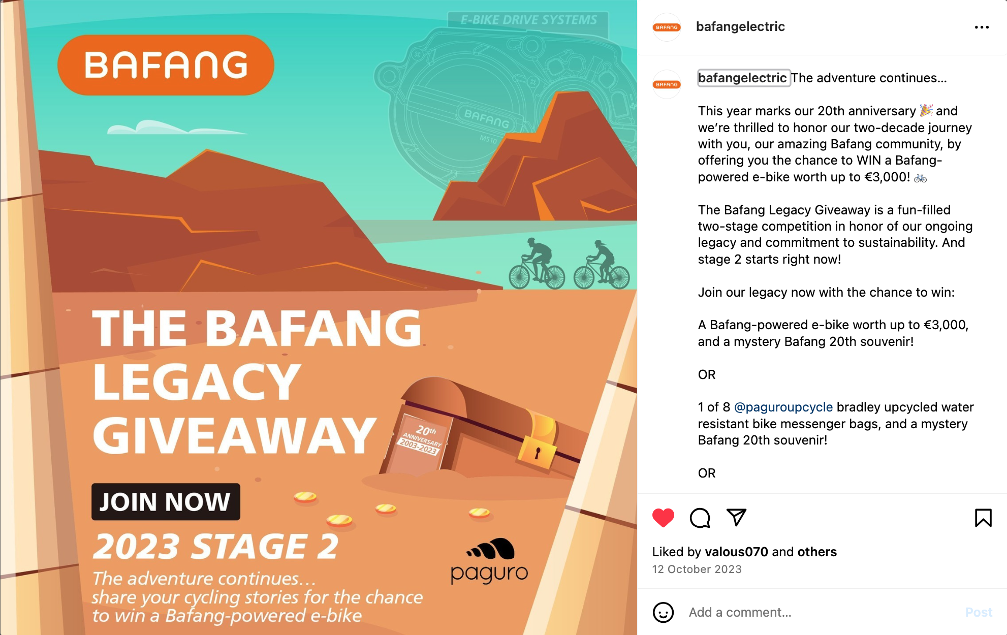 Bafang celebrated their 20th year of e-bike innovation in 2023! To celebrate, I conceptualised, organised, and executed a large-scale international giveaway via Gleam to reward fans for their continued support. The brief was to produce an activity that highlighted this wonderful milestone for the brand while also highlighting their commitment to sustainability in the sector.