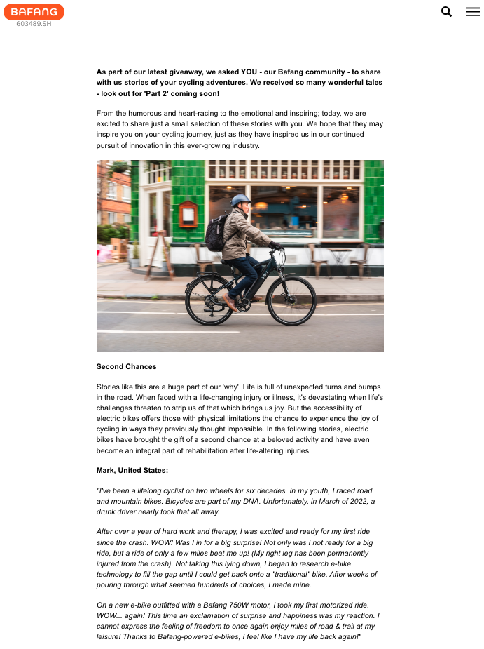 From large-scale giveaways to partner outreach, email marketing, consultancy, data analysis and reporting, market research, and more, I am proud of the work I have done to further cement Bafang’s position as a leading supplier of e-bike drive systems, helping to develop the brand’s human presence and establish positive relationships with customers via online platforms.
